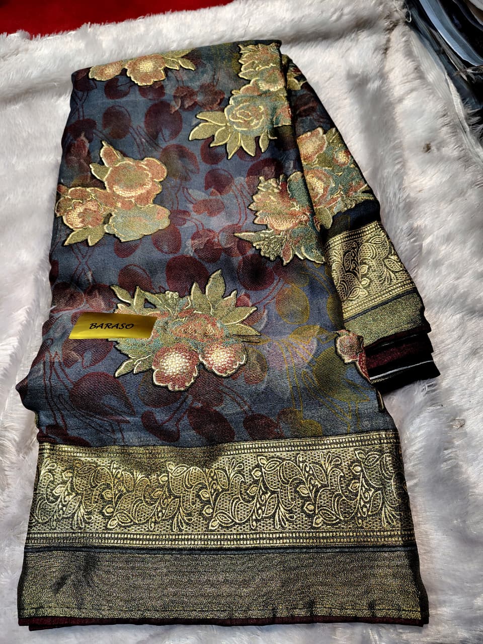 Elevate your ethnic collection with this exquisite Baraso saree, a textile marvel known for its unique 'burn-out' technique which creates semi-transparent, textured patterns. Crafted on a soft, flowy fabric base (likely a mix of georgette/chiffon and viscose), this saree features captivating large floral motifs in subtle gold and maroon tones against a sophisticated dark teal/blue base. The lower section has a dense pattern, and the entire look is enhanced by a magnificent, broad gold zari woven border. This lightweight and comfortable saree drapes elegantly and is perfect for any formal event, party, or wedding.