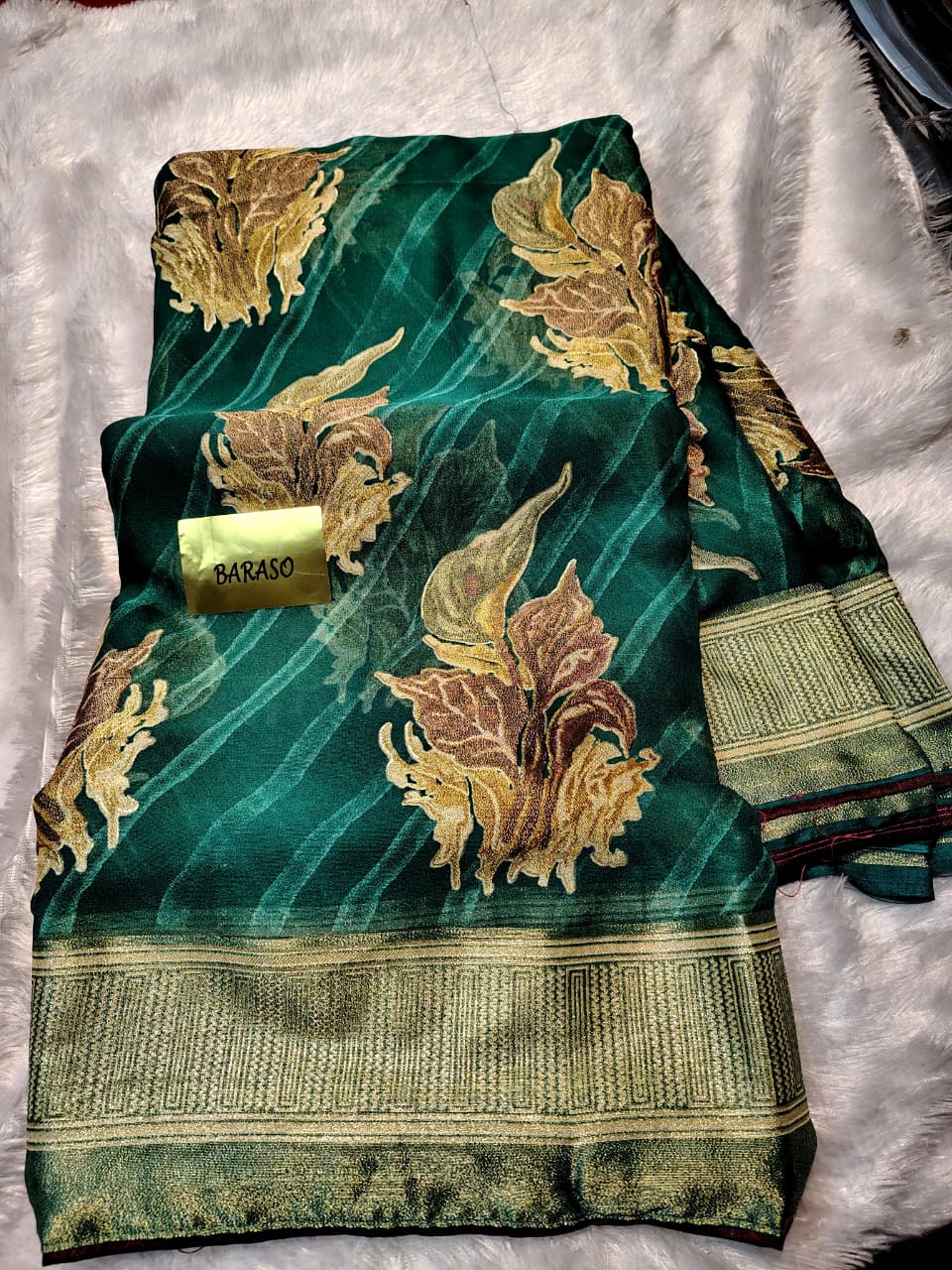 Elevate your ethnic collection with this exquisite brasso saree, a textile marvel known for its unique 'burn-out' technique which creates semi-transparent, textured patterns. Crafted on a soft, flowy fabric base (likely a mix of georgette/chiffon and viscose), this saree features captivating large floral motifs in gold and light pink/lavender tones. The stunning forest green body flows beautifully and is enhanced by a magnificent, broad gold zari woven border featuring unique motifs.