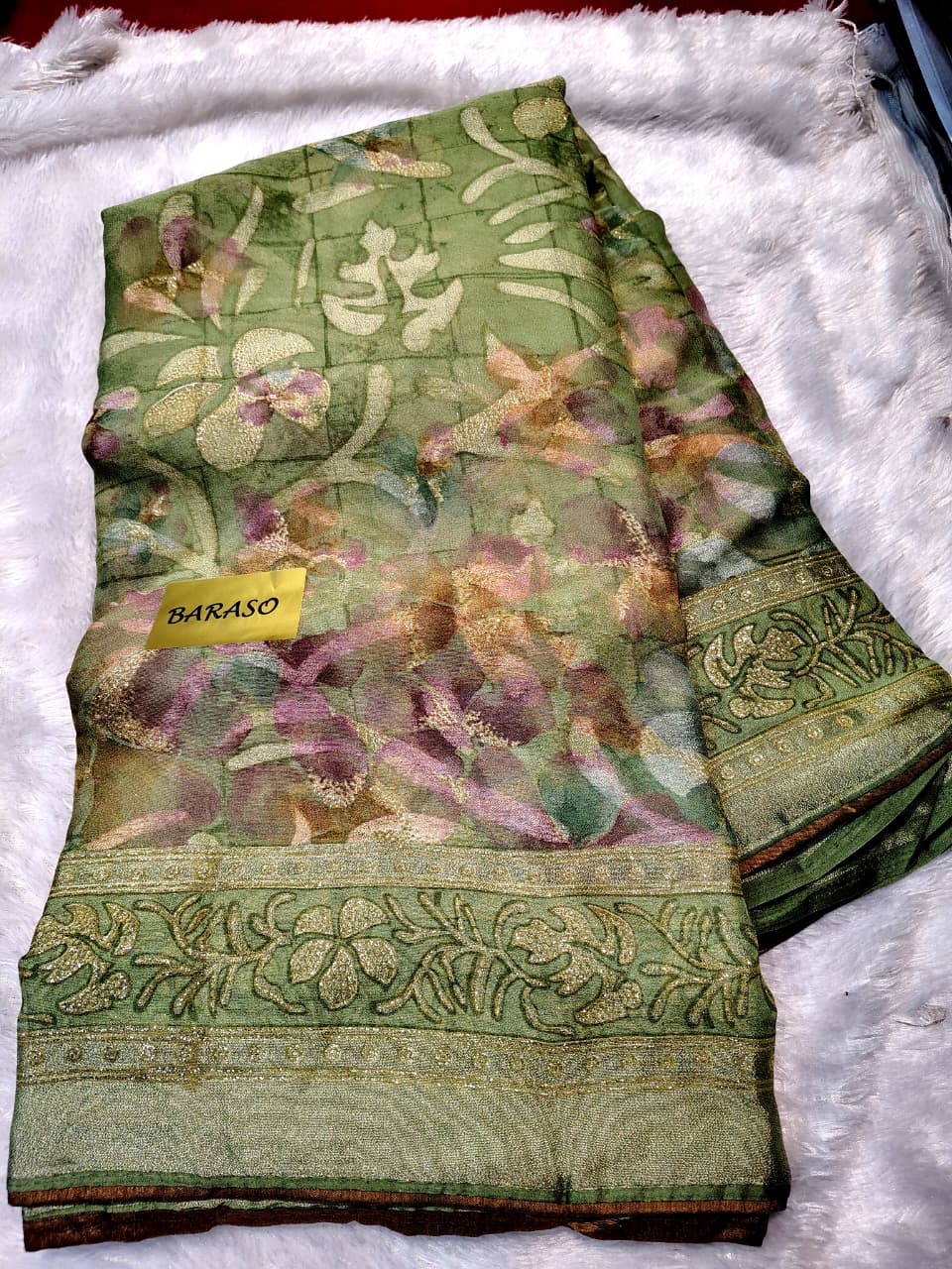(Elegant Olive Green Baraso Saree with Gold Zari Border & Contrast Blouse )